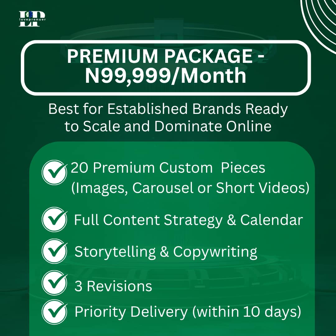 Our Premium Content Creation Package is best for established brands that wants to stay consistent and dominate the online space, with 20 custom-designed posts delivered in 10 days. For more information, contact Us HERE